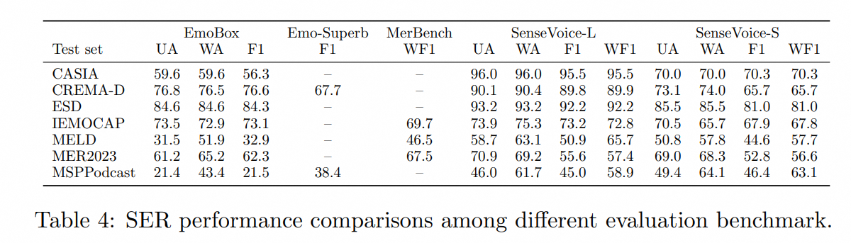 Furthermore, we compared multiple open-source speech emotion recognition models on the test sets, and the results indicate that the SenseVoice-Large model achieved the best performance on nearly all datasets, while the SenseVoice-Small model also surpassed other open-source models on the majority of the datasets.