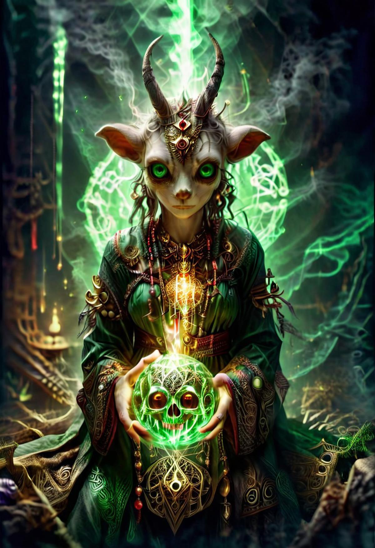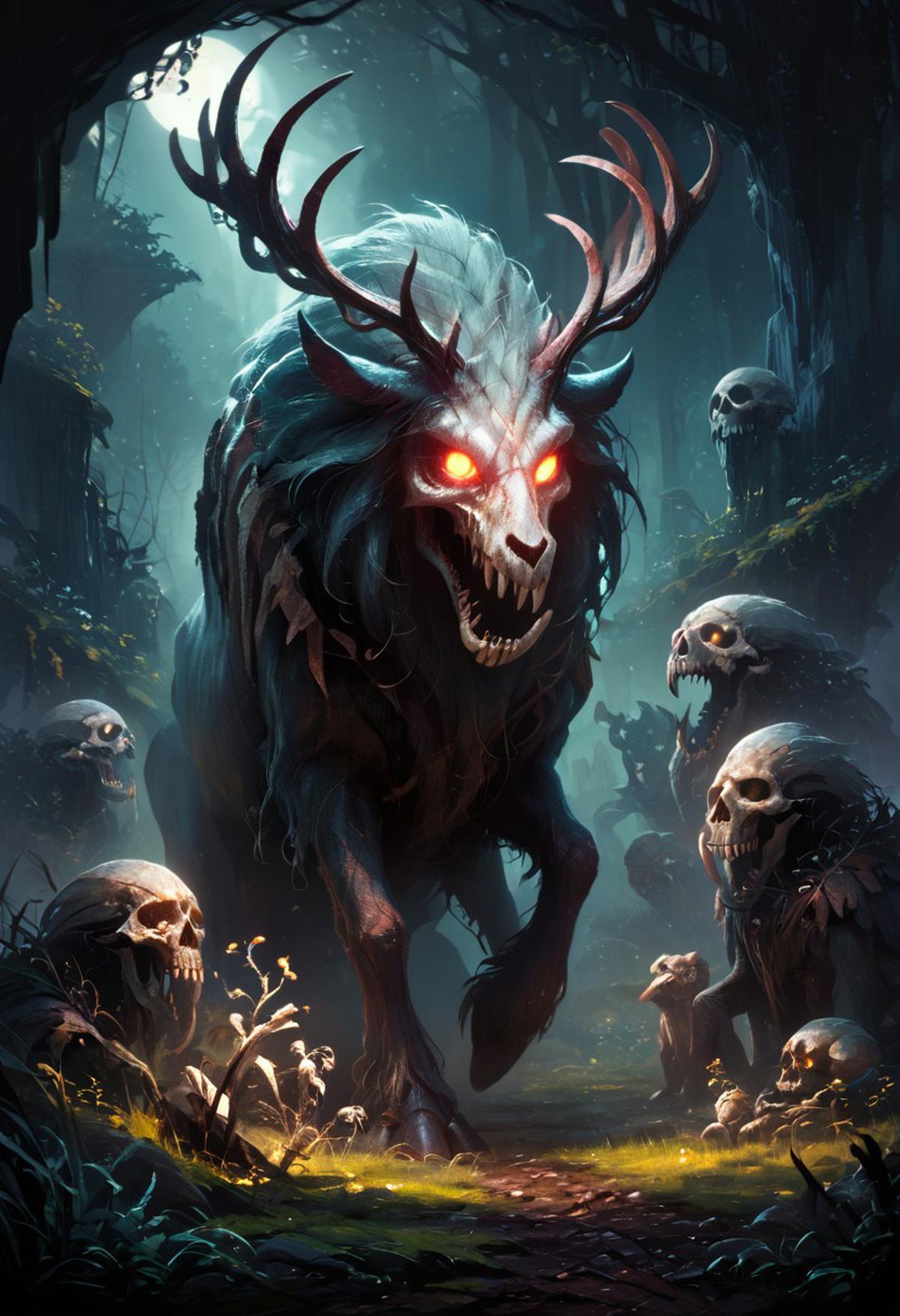 score_9 score_8_up score_7_up source_film (hooded figure wendigo skull antlers) bone armor shoulder armor outdoors night night sky dark background dark forest w00f simple background animal focus skull ((glowing eyes)) open mouth sharp teeth concept art digital art realistic dark fluorescent