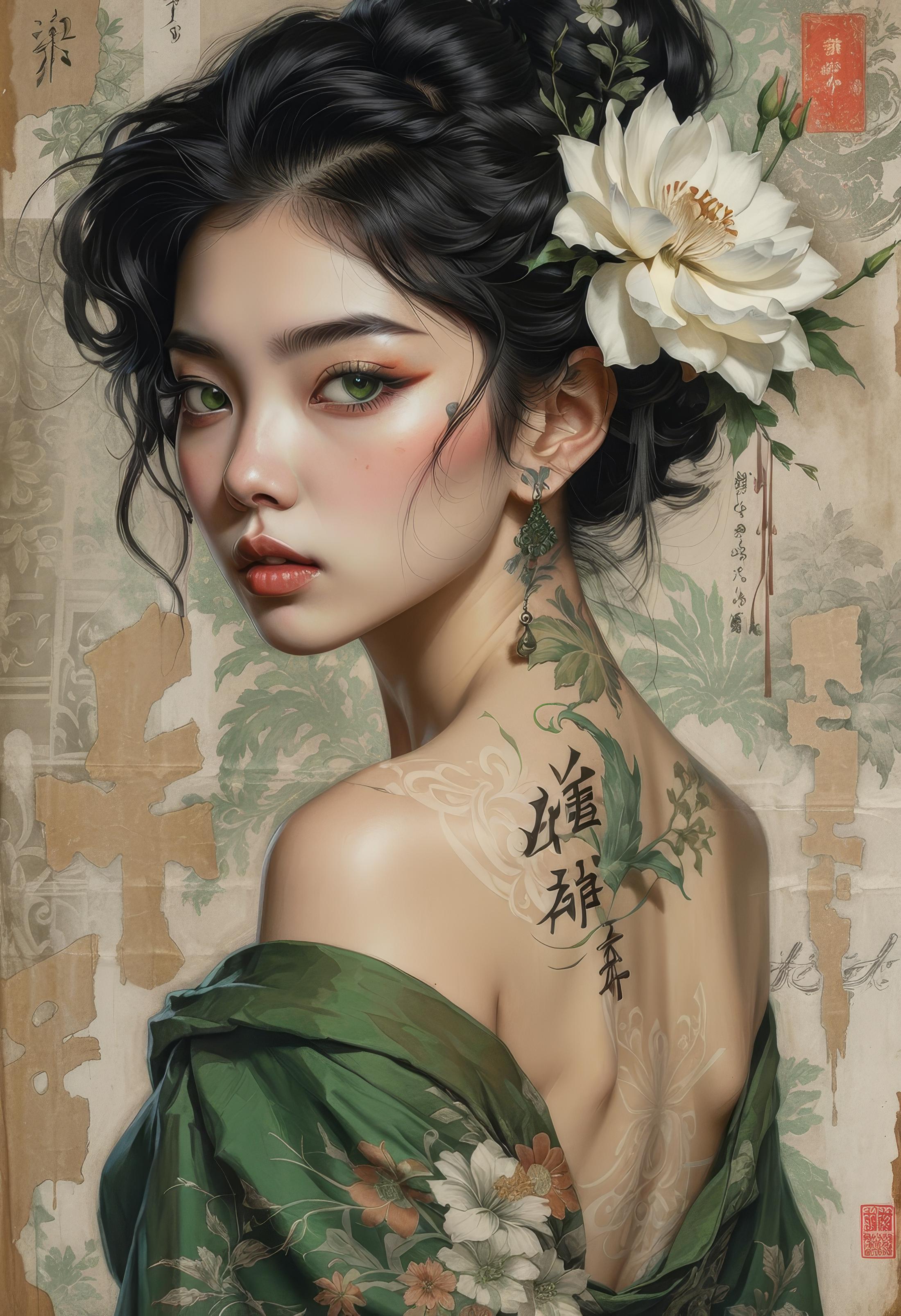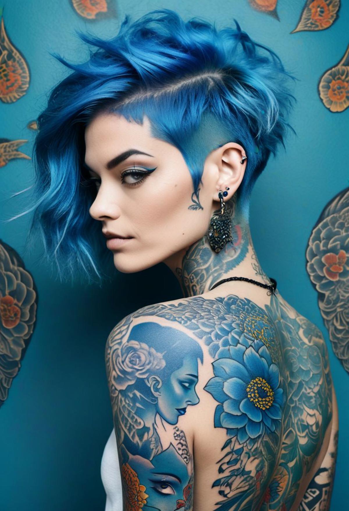a woman with short blue hair styled to one side adorned with tattoos on her back. Her vibrant blue hair contrasts beautifully with the intricate tattoos each design telling a story of expression and artistry. The scene captures a moment of self-expression and individuality where the woman's unique style and tattoos reflect her inner creativity
