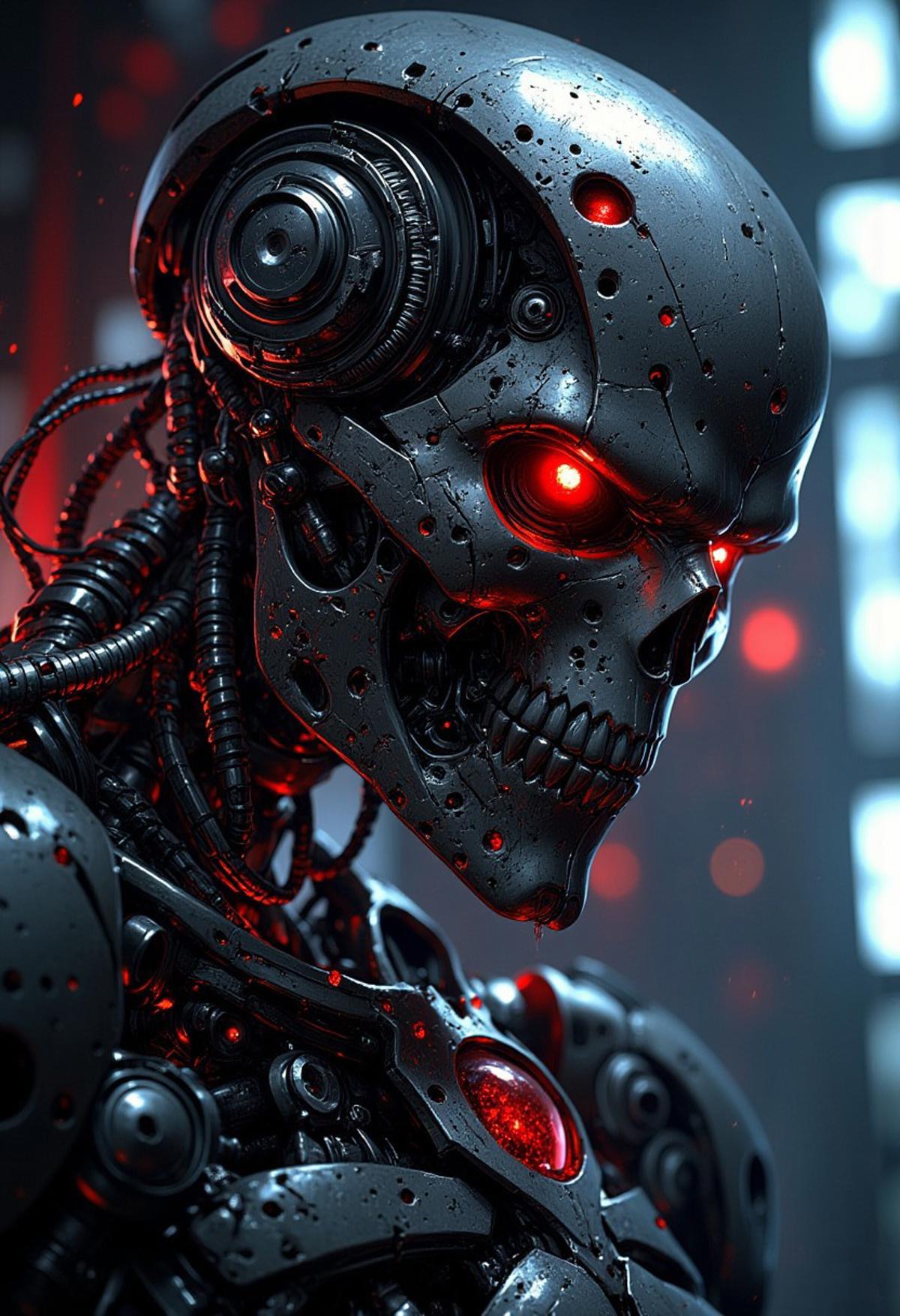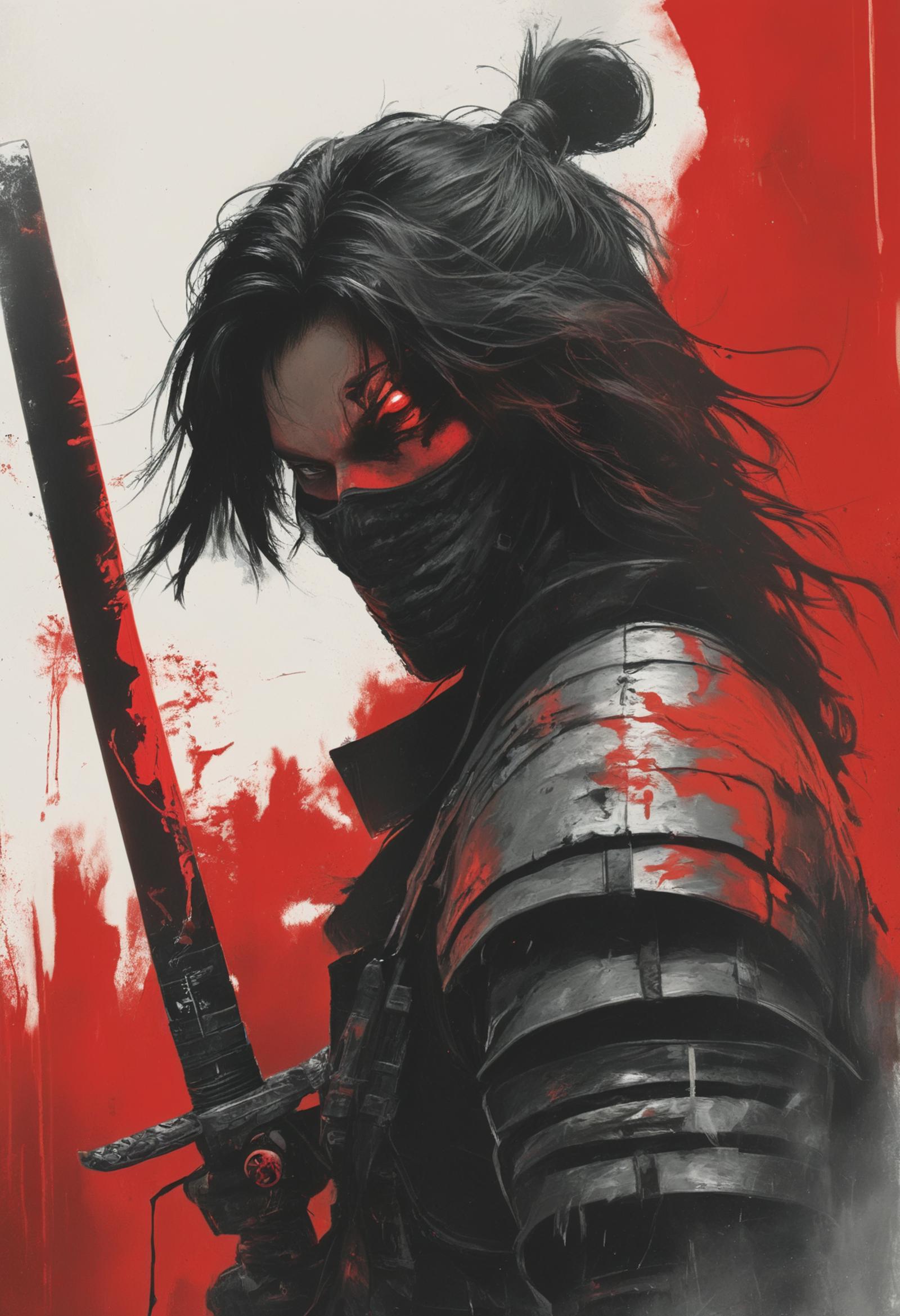samurai cyberpunk theme two-tone black hair side view from side monochrome red theme white theme shadowed face shiny eye red eyes smoke masked hidden face samurai armor cowboy shot red katana red blood stain standing red background painting