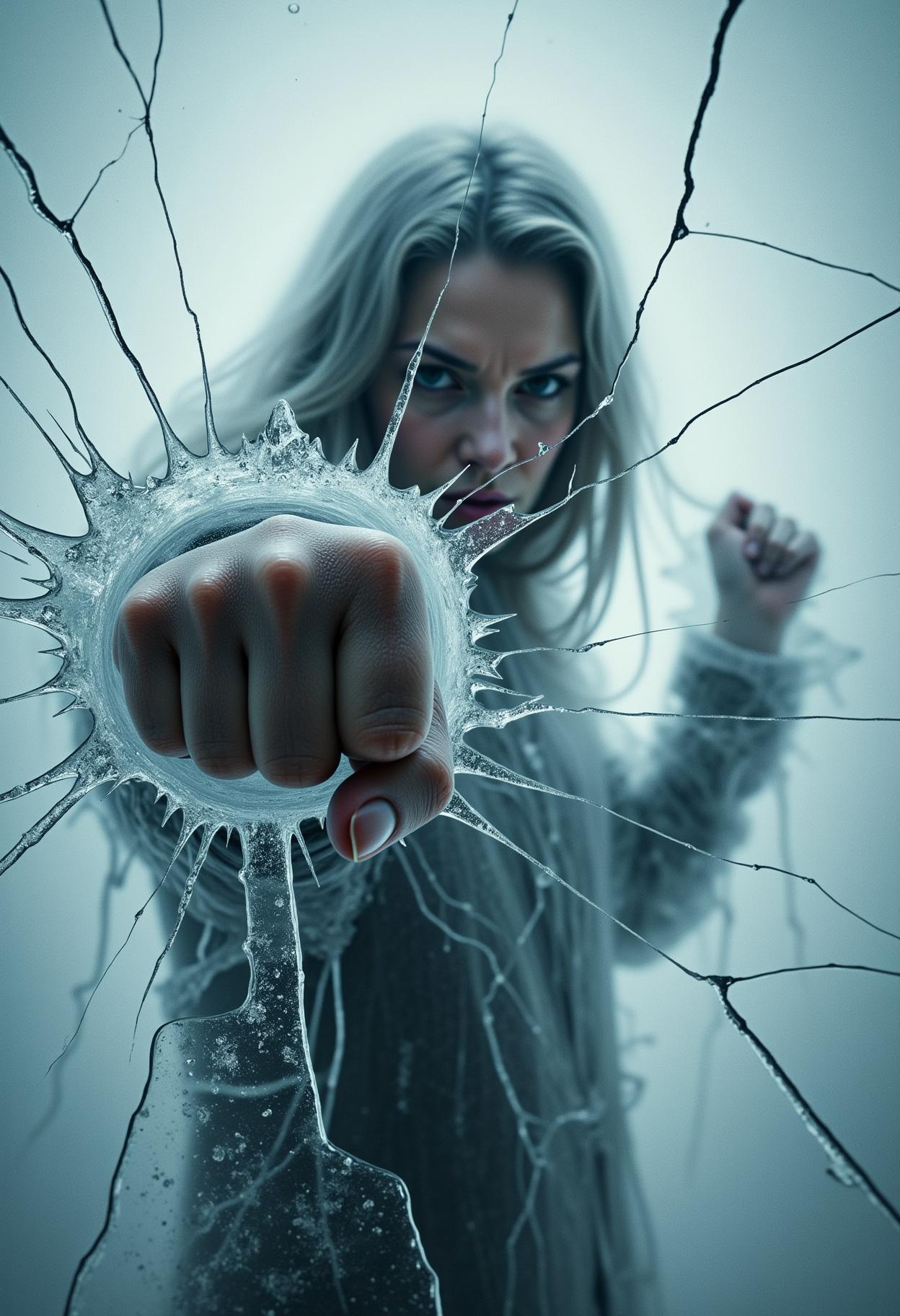 surreal art an angry woman dramatically punches through a cracked ice curtain that covers the screen and separates her from the viewer. her faded figure facing the viewer and looking over her fist is obscured by the solid ice sheet. all that is visible is a close-up of her extended left arm and her fist breaking the ice apart with a thundering blow leaving behind motion trails. the entire image is covered in a thin sheet of ice except the area around the woman's fist. her knuckles appear bruised due to the impact <lora:Dever_Flux_Enhancer:0.5>