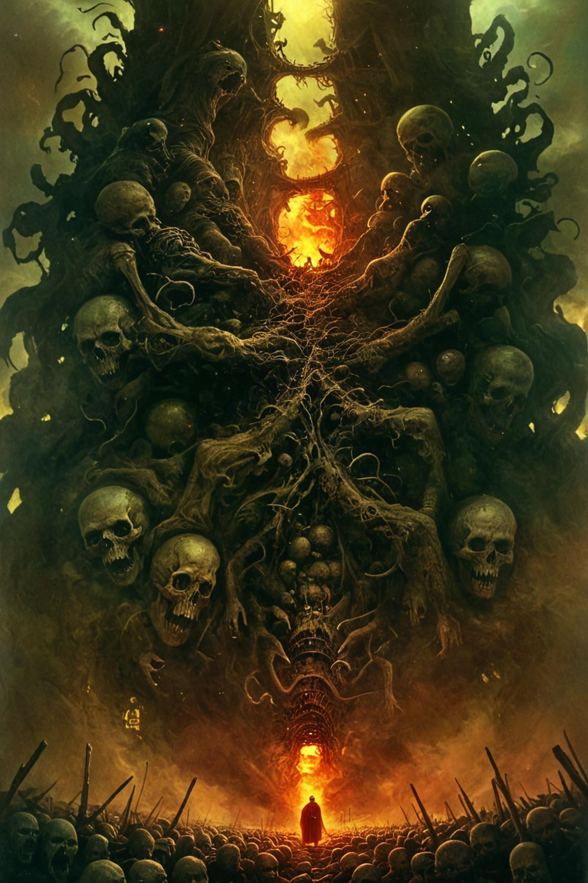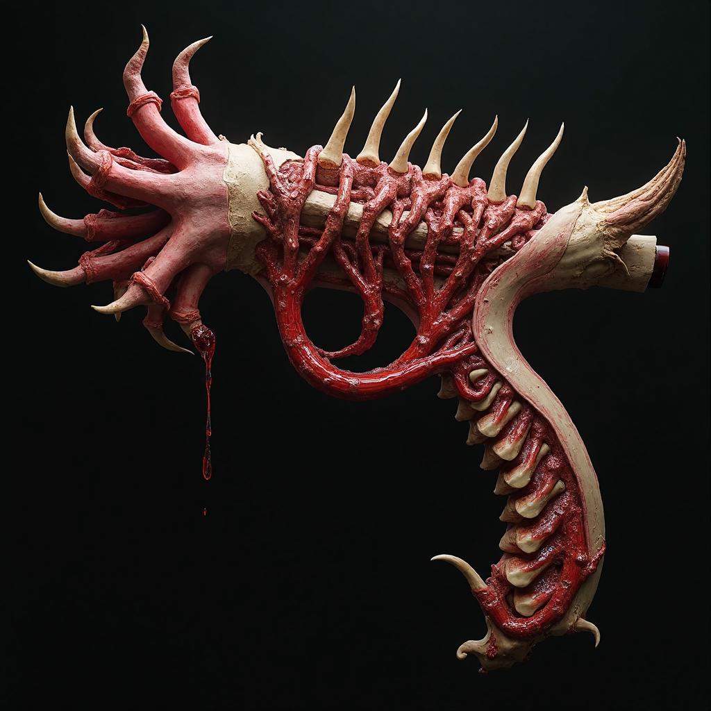 This nightmarish weapon is crafted from living flesh and distorted bone its barrel a pulsating artery intertwined with sinewy tendons and held together by grotesque patches of stretched skin. The grip is a cluster of jagged claw-like fingers each bone exposed and glistening with fresh blood while the stock is a twisted spinal column pulsating with a sickly glow connected by strands of exposed nerves that twitch faintly. Blood vessels run along the weapon’s surface oozing dark thick fluid as the entire creation appears to be on the verge of writhing to life a horrific amalgamation of flesh bones and decaying tissue.